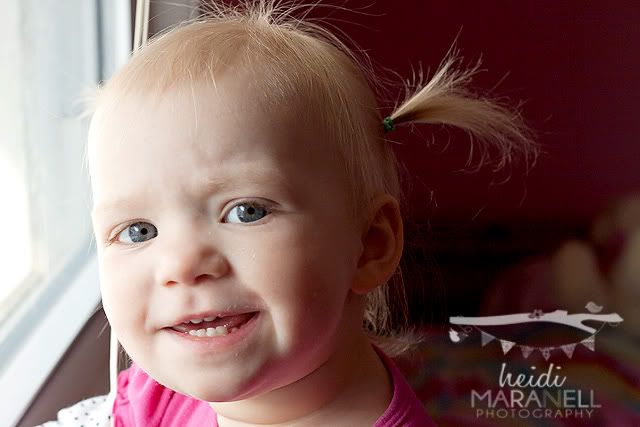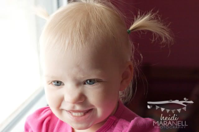 Miss D's hair is FINALLY long enough that I can put a "type" of pigtails in her hair. She has the traditional mullet hair style, but I was able to gather enough little clumps of hair to make a hairstyle. Even if she only let them stay in for an hour. Here are the many faces of Delaney...all with pigtails! :)